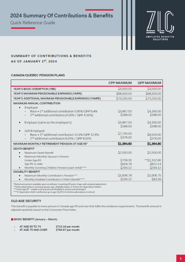 Here is ZLC Employee Benefits Solutions’ annual Summary of Contributions overview. It is quick reference tool that provides a summary of Canadian statutory programs and taxation of employee benefits.
